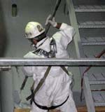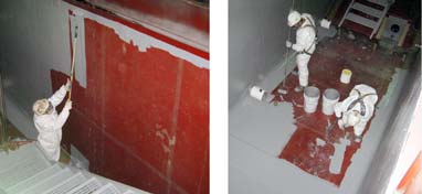 UCC applied the first spray coat of ChemLINE 784-32 (red) to the floors and walls of the dip and weir tanks and the suspended stairs at 6-8 mils (150-200) microns wet film thickness in accordance to the specification.